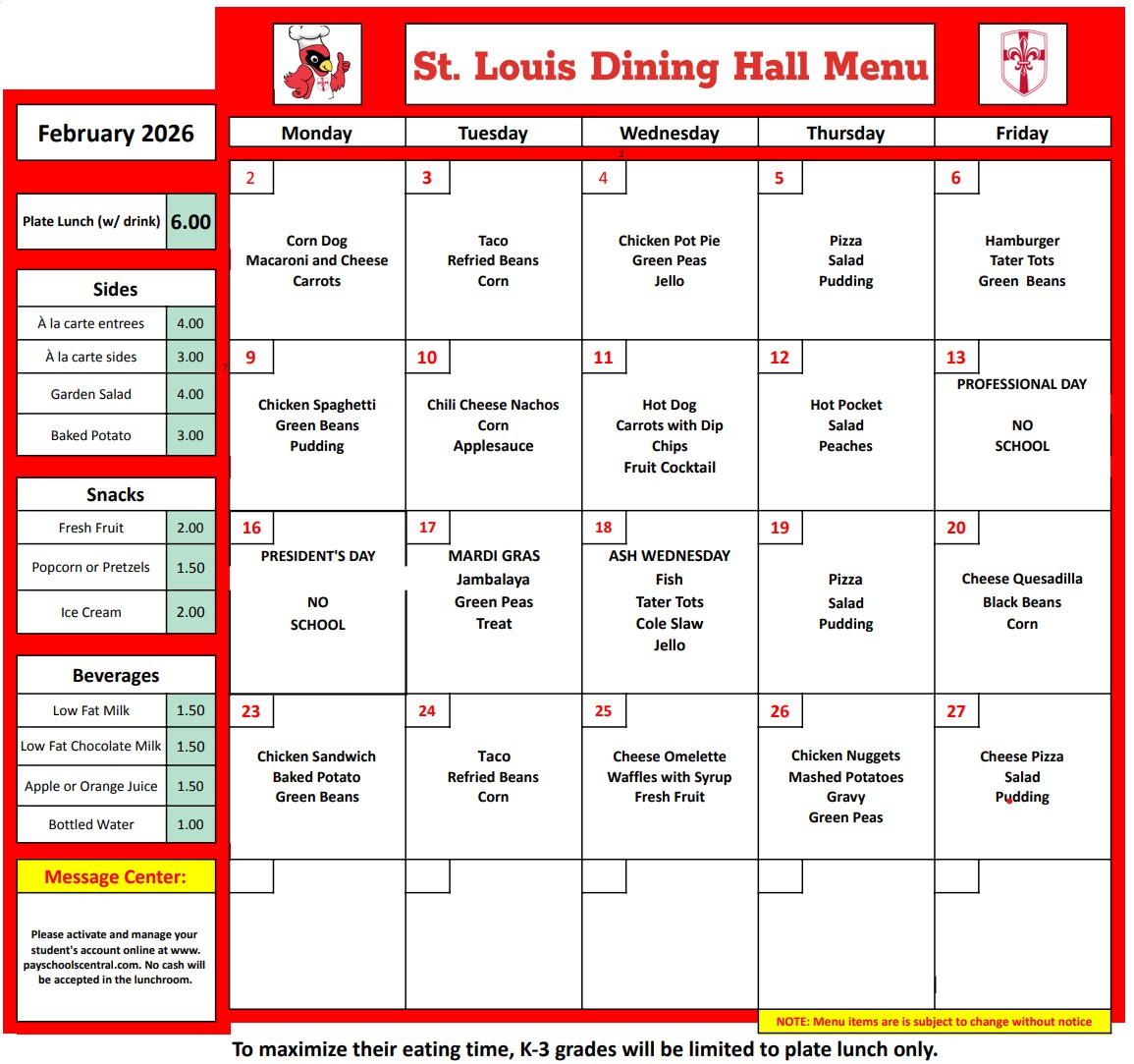 Nutritionally appropriate meals are prepared daily and served by parent volunteers. View our current menu.